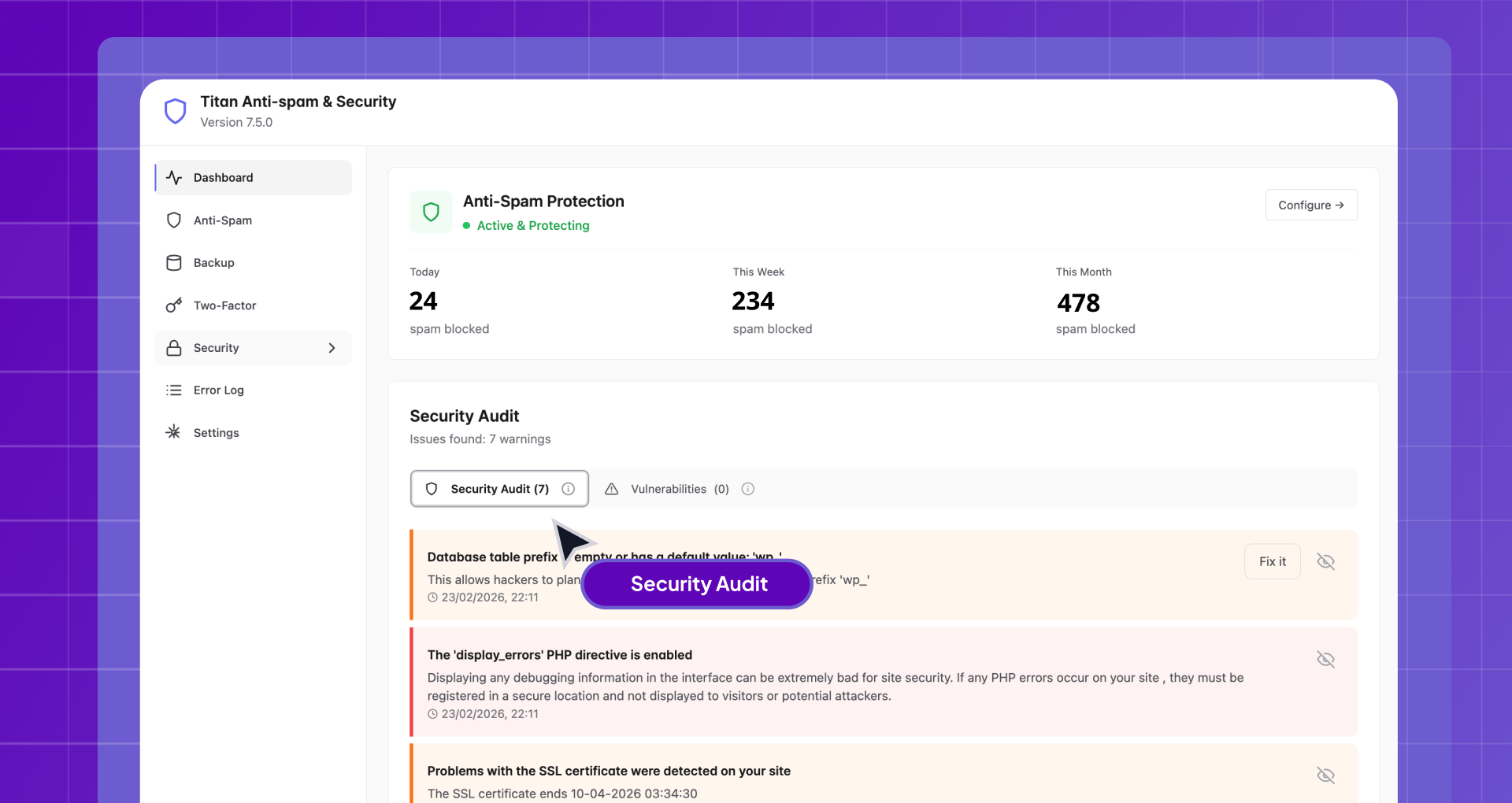 Titan Anti-Spam & Security is a complete protection solution designed to secure your website against spam, login attacks, and unauthorized access.