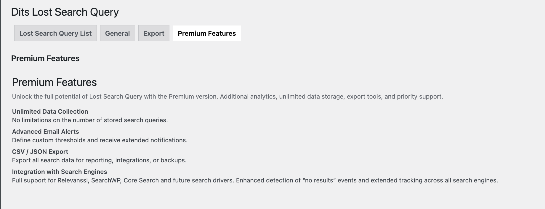 DITS Lost Search Query Results is a lightweight and efficient plugin that tracks search queries on your site that return no results. By collecting and analyzing these “lost” queries, you gain valuable insights into what your visitors are looking for but not finding — giving you a clear roadmap for improving your content.