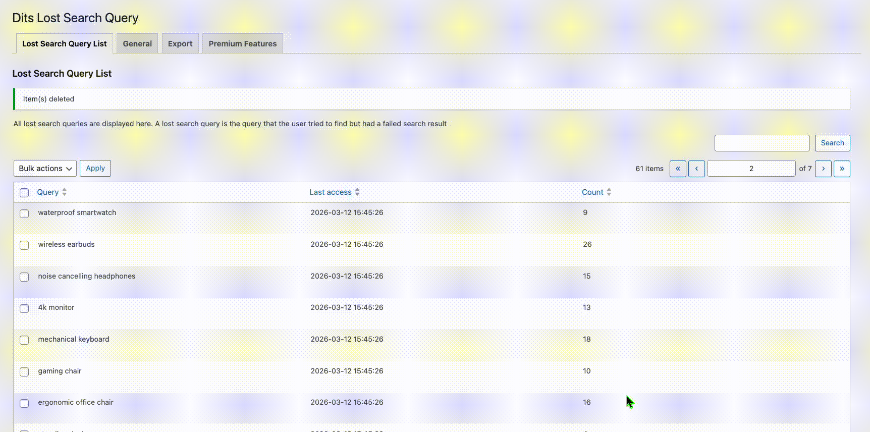 Once activated, no additional configuration is required. The plugin begins logging all search queries that result in no matches. You can: