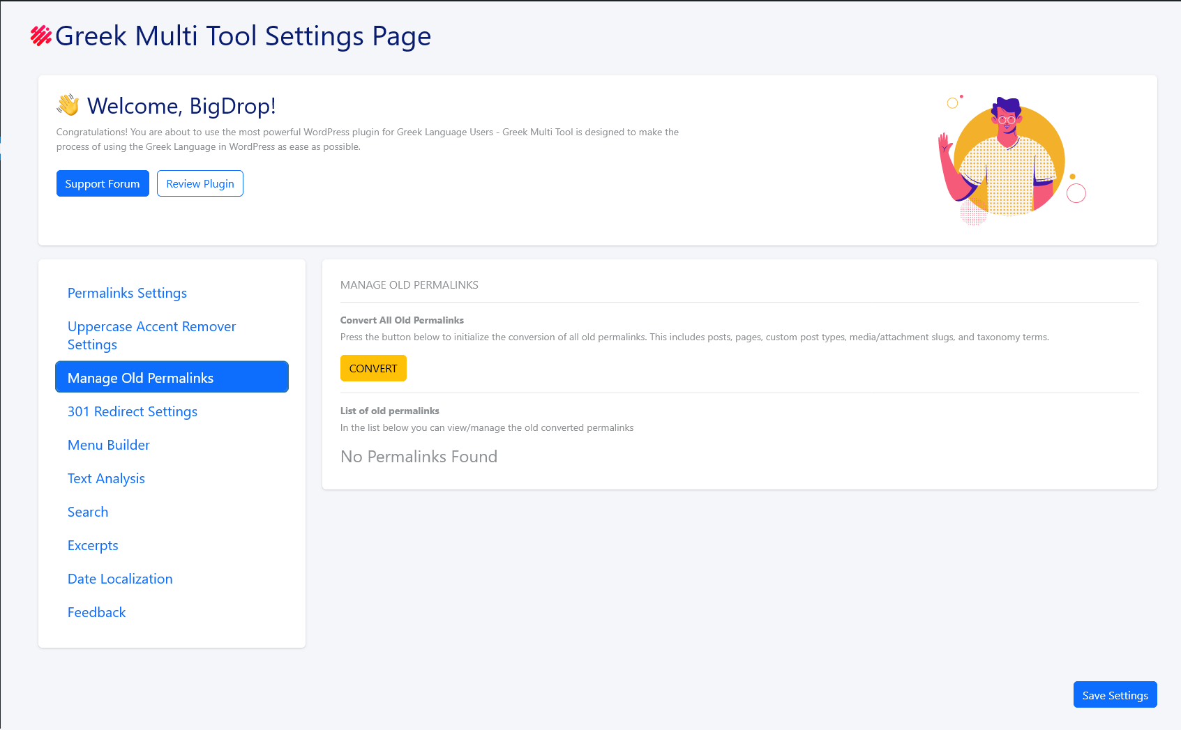 Navigate to Greek Multi Tool Convert Old Permalinks and click “CONVERT”. The plugin safely handles posts, pages, custom post types, media attachments, taxonomy terms, and sets up 301 redirects.