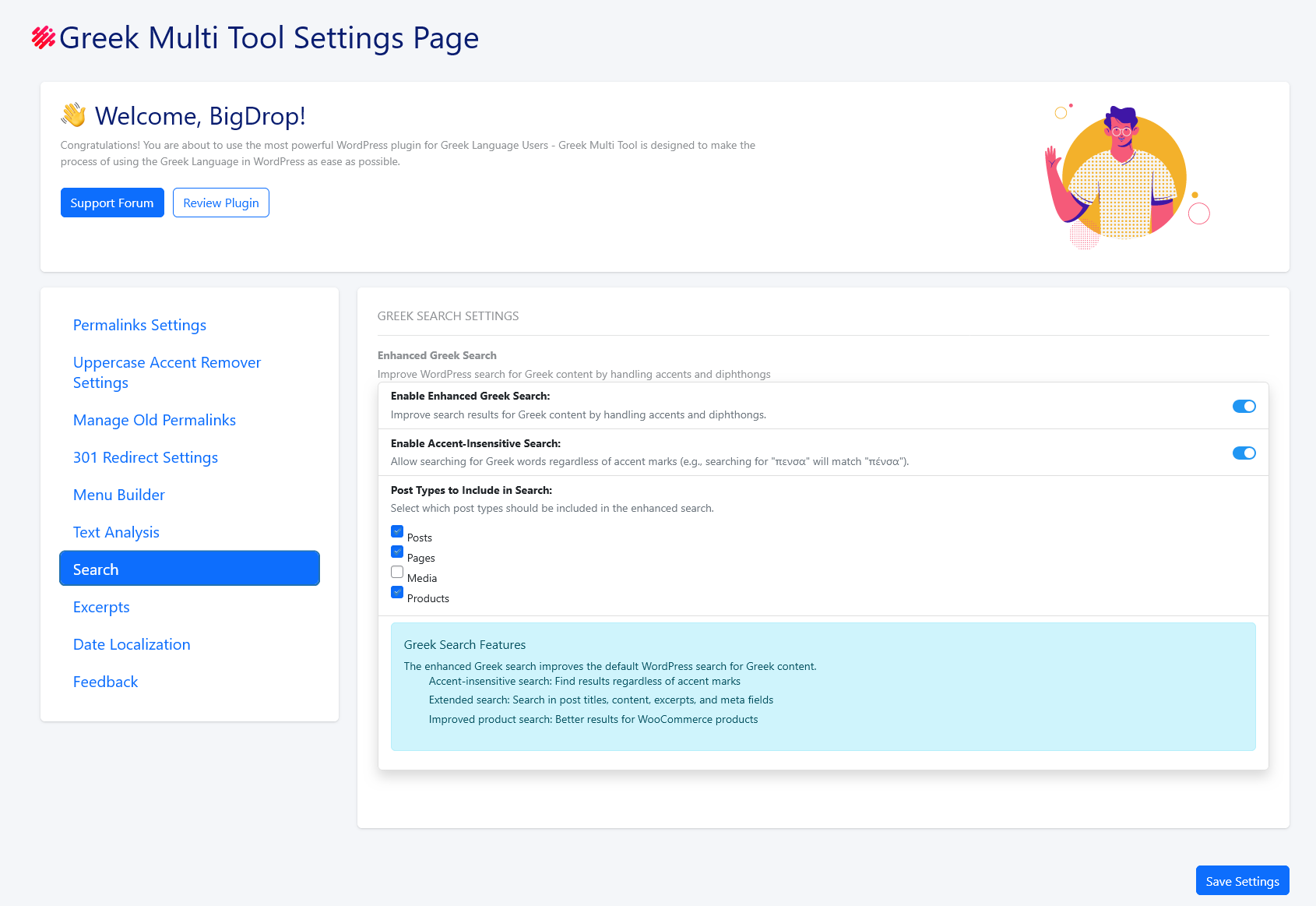 Absolutely! Greek Multi Tool seamlessly integrates with WooCommerce to handle Greek permalinks, media, accents, and search for your product pages.