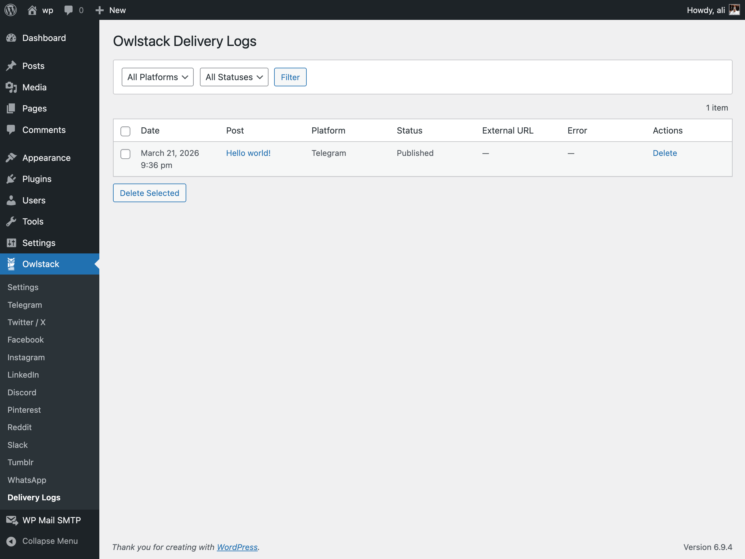 wp_owlstack_delivery_logs). You can view them under Owlstack > Delivery Logs.