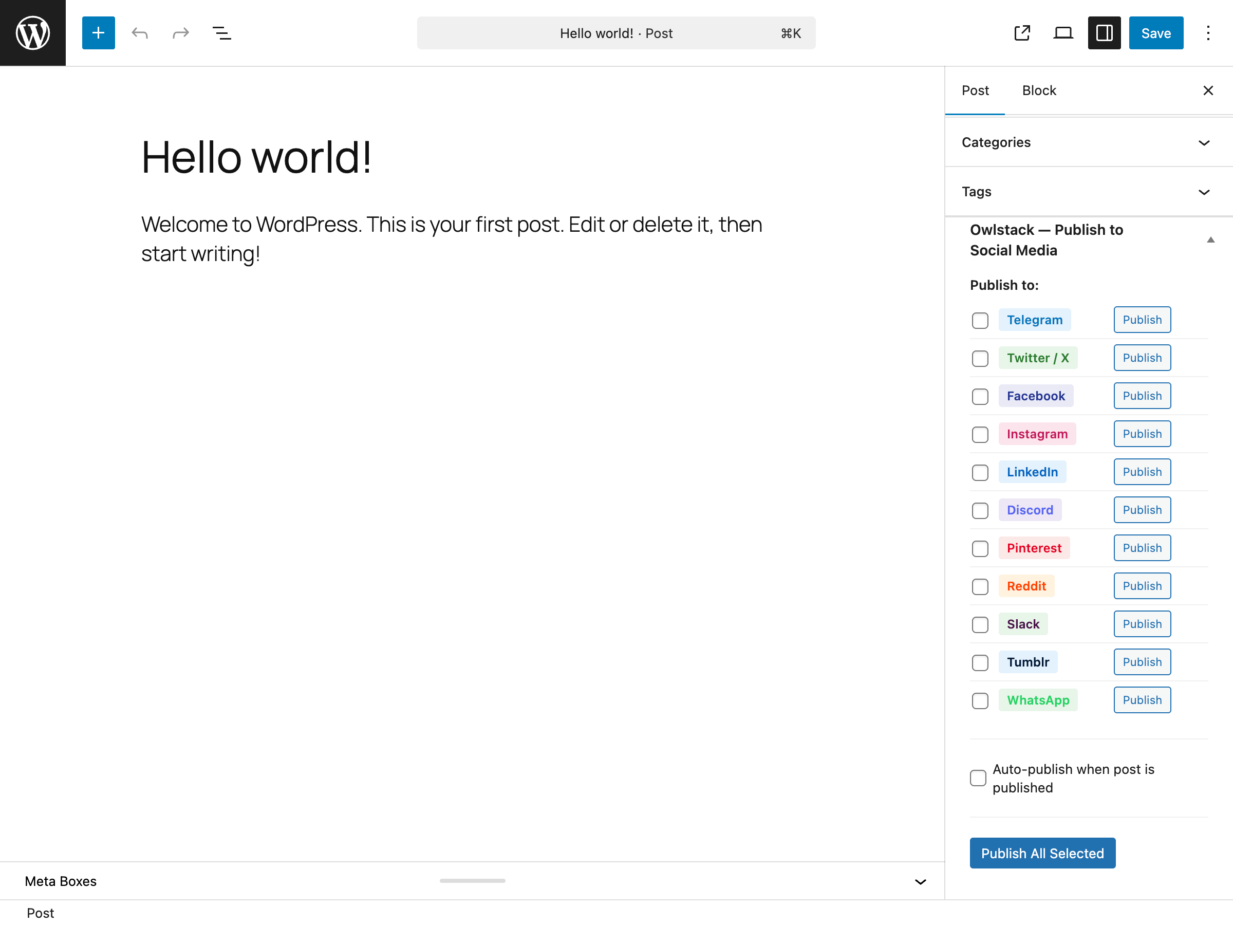 - Publish Meta Box — Select platforms and publish directly from the post editor