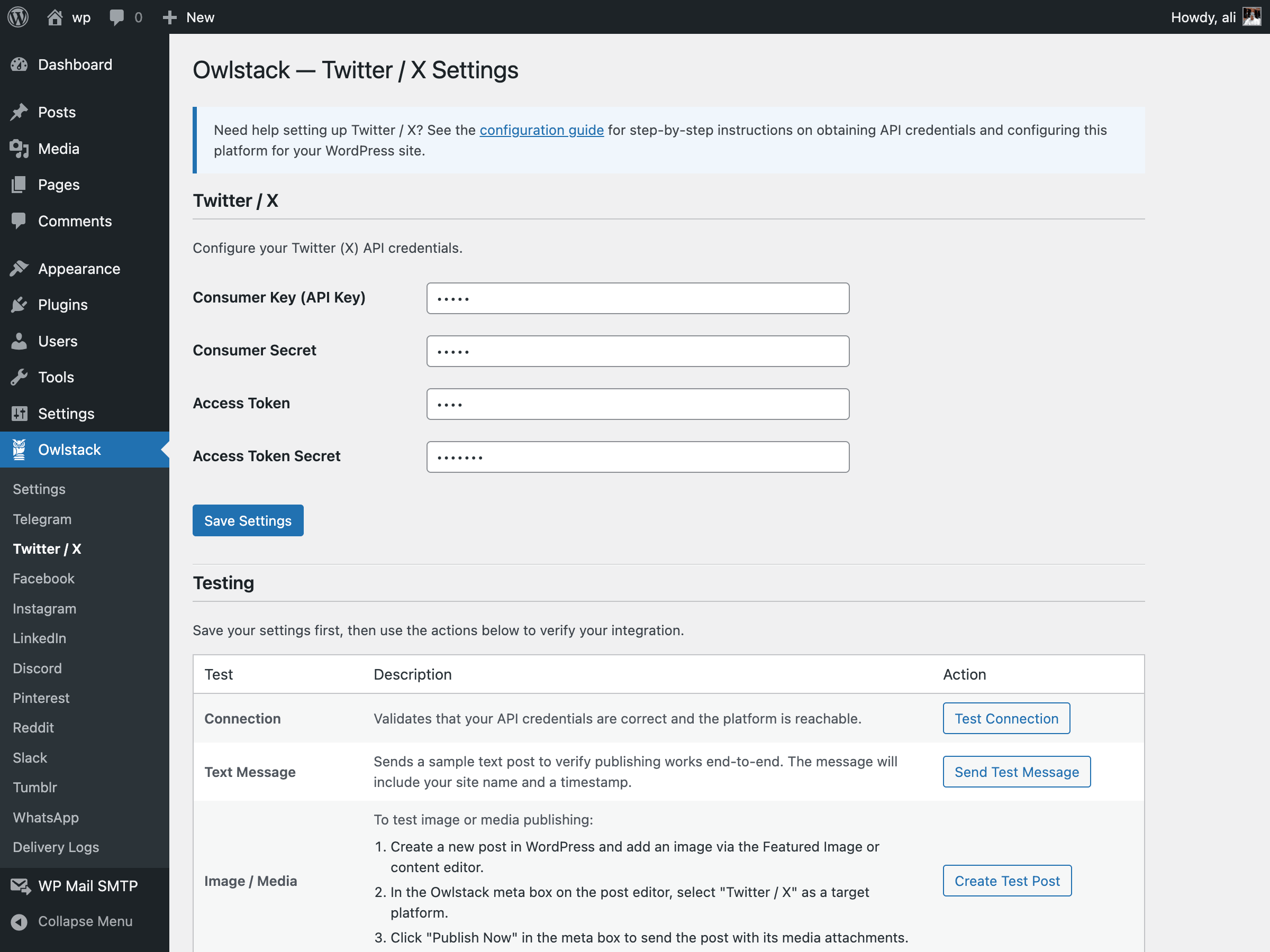 - Twitter/X: Create an app at developer.twitter.com and generate your API keys.
