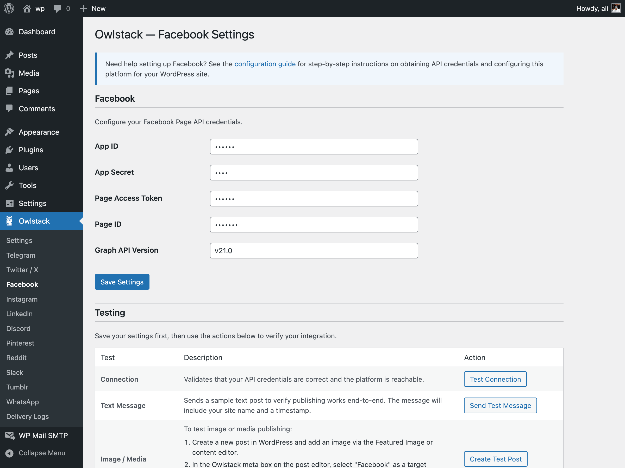 - Go to Owlstack > Settings to configure your platform credentials.