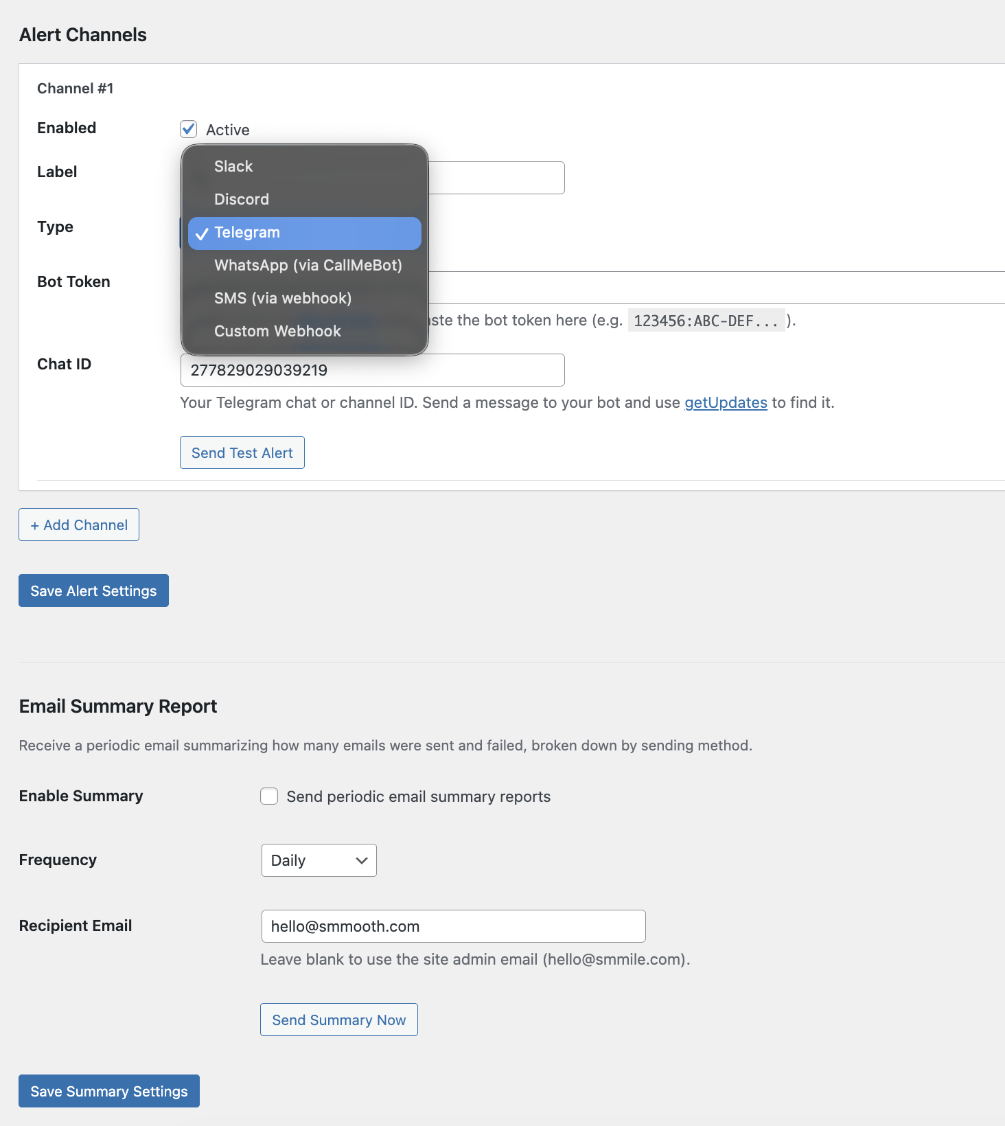 - Send Test Alert button per channel
